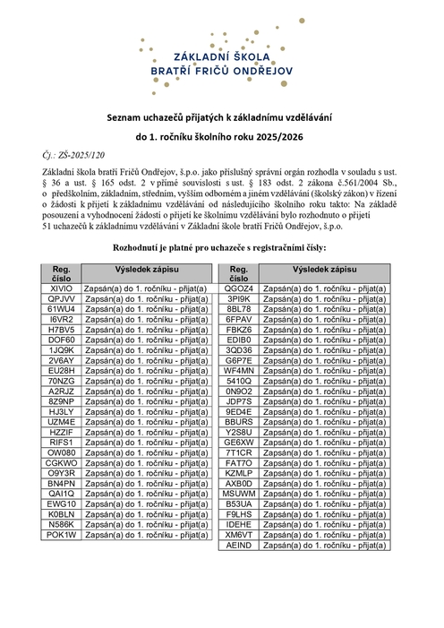 Úvod > Škola > Zápis > Seznam uchazečů přijatých k základnímu vzdělávání