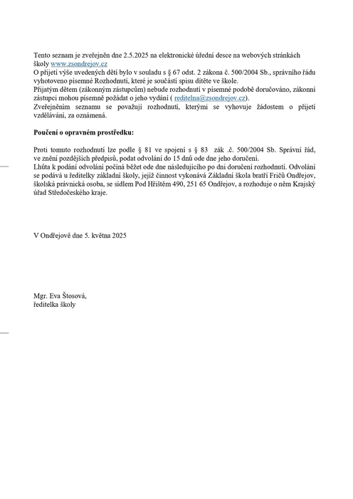 Seznam uchazečů přijatých k základnímu vzdělávání